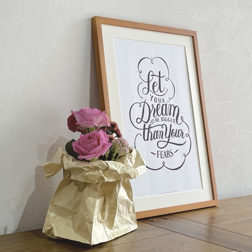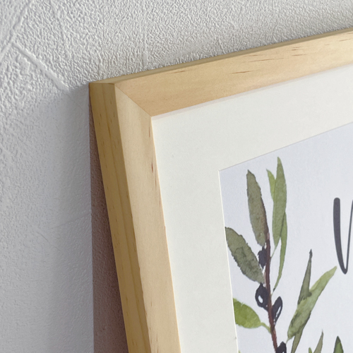 そこで!おすすめは、フレームの幅が1cmのシンプルな木製フレームです。フレームの外寸:440mm×334mm(内寸:420mm×314mm)とかなり大きめ。しっかりと目立ちます。カラーは白っぽいナチュラルと、暗すぎないブラウンの2色展開です。セットの紙マットは写真サイズのワイド四切に対応しています。とてもシンプルでナチュラル!飾る内容を選びません。