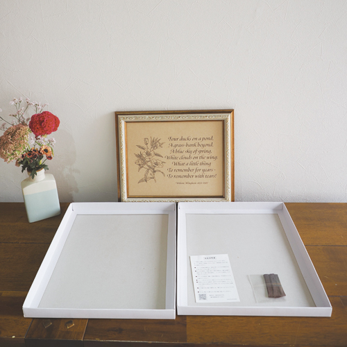 大きな作品向きではないですが、小さめの作品にお勧めです。中マットを取ると、内寸は254mm×203mmとなっています。白いかぶせ箱入りです。フレームの種類によって若干の外寸サイズにつがいがあります。