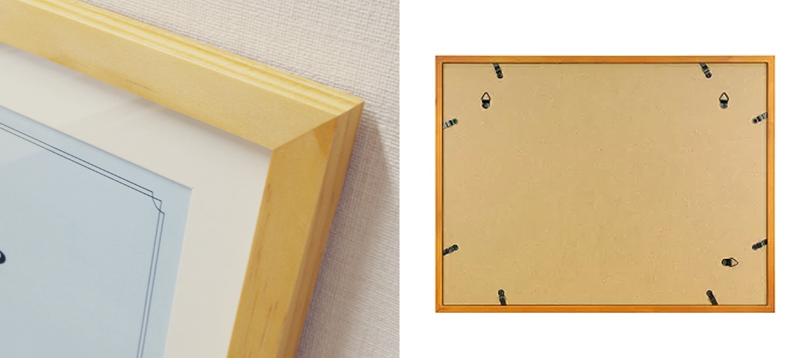 ナチュラルの角アップと裏面(ブラウン)の様子です。フレームが細いため、吊り金具は裏板についています。スタンドはついていません。白いかぶせ箱入りです。
