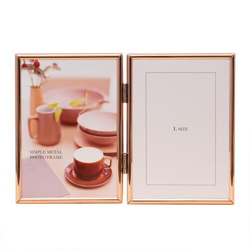写真が引き立つシンプルデザインのメタルフレームです。背面はベロア生地を使用し、高級感のある仕立てです。2面タイプで開く角度を調整できます。