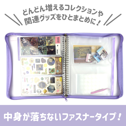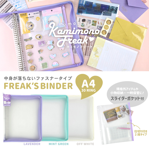“紙モノ専用”のコレクション収納シリーズ「motto?カミモノフリーク」。シリーズのリフィール類をまとめて収納できる、30穴のファスナー付きリングバインダーです。規格外のシールや小物の収納、一時保管など自由に使える便利なスライダーポーチ付き。A4サイズに対応。