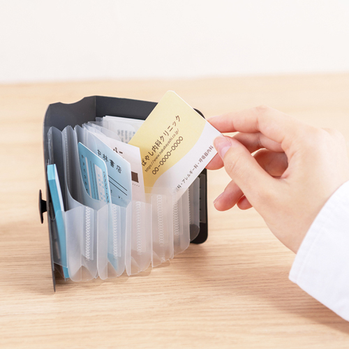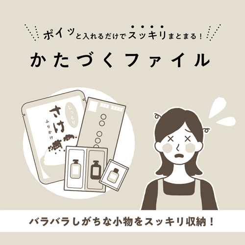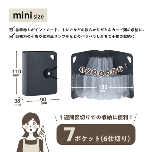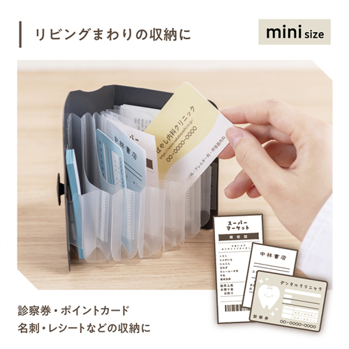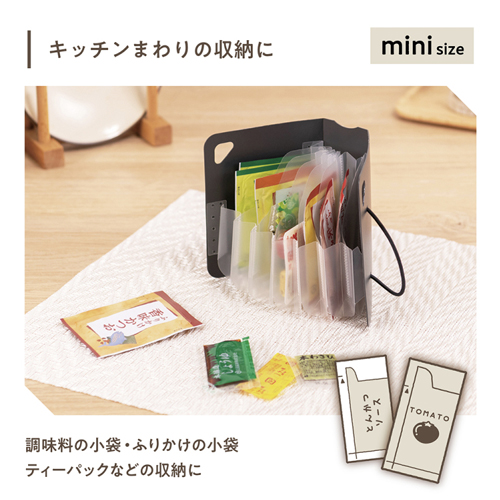 miniサイズは、調味料の小袋や化粧品サンプル、カード類やレシートなど、バラバラしがちな小物の収納に。