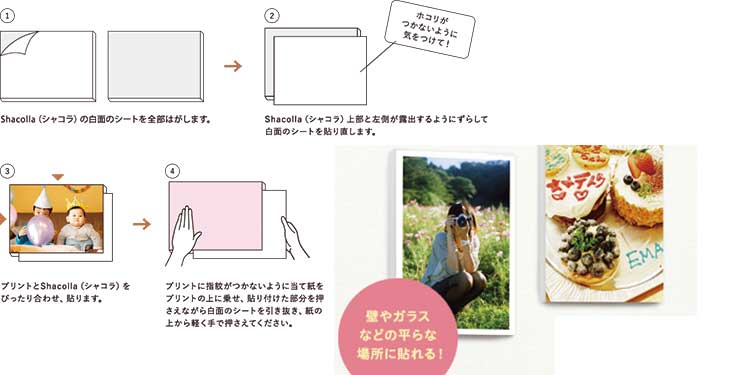 壁やガラスの平らな面に貼り付けて、その上に自由に写真を貼り付けられる両面貼り付けシート。